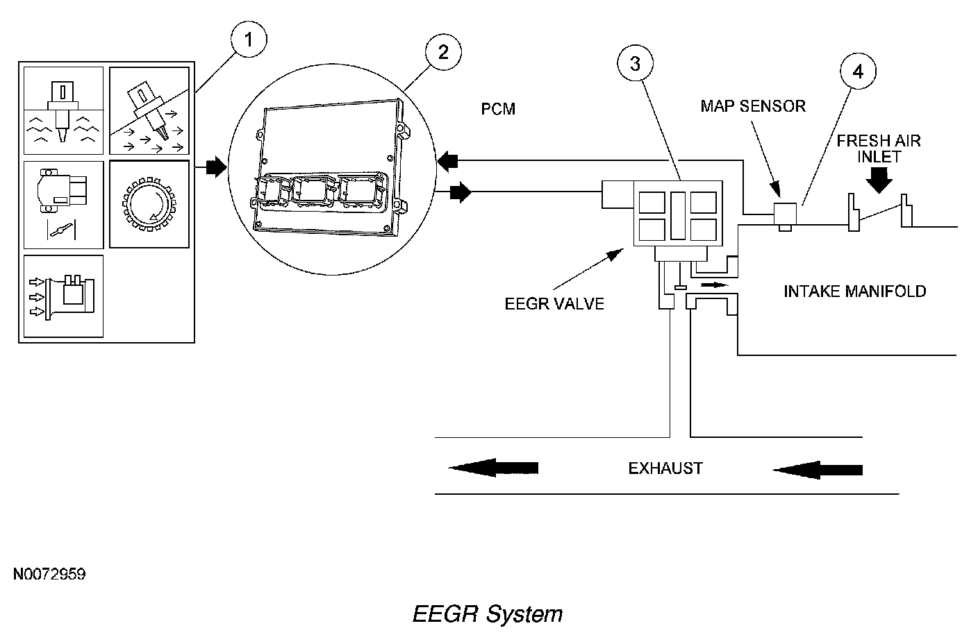 The EEGR system consists of an electric motor EGR valve integrated assembly, a PCM, and connecting wiring. Additionally a manifold absolute pressure (MAP) sensor is also required. For additional information on the EGR system components, refer to Engine Control Components. Operation of the system is as follows: