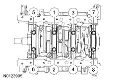 Install the new 8 main bearing cap side bolts. Tighten in the sequence shown in 2 stages.