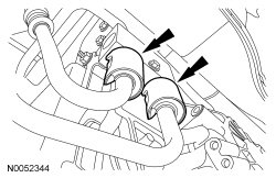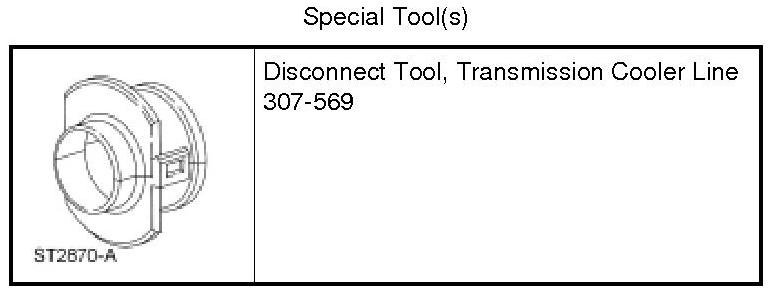6. Using the Transmission Cooler Line Disconnect Tool, disconnect the transmission fluid cooler tubes from the transmission fluid cooler thermal bypass valve and remove the transmission fluid cooler inlet and outlet tube and hose assembly.