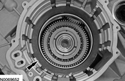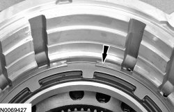 234. Compare the position of the low OWC (One-Way Clutch) snap ring gap with the tab on the low/reverse clutch pressure plate to be sure that the gap is in the right position.