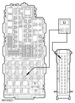 - Measure the resistance between rear window defrost relay socket pin 2, circuit CH122 (WH/OG), harness side and HVAC module C228A-12 (without Navigation) or C2356A-12 (with Navigation), circuit CH122 (WH/OG), harness side.
