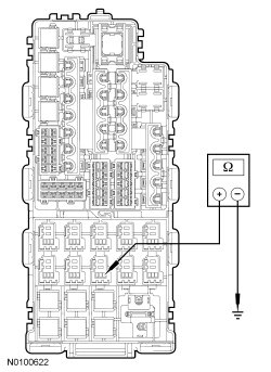 - Measure the resistance between rear window defrost relay socket pin 2, circuit CH122 (WH/OG), harness side and ground.
