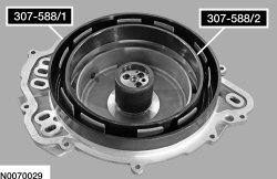 154. Remove the Reverse Clutch Piston and Retaining Ring Set 307-588/1 and 307-588/2.