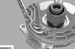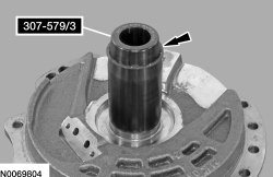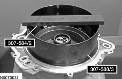 Install the Forward/Intermediate Spring Compressor 307-584/1 and 307-584/2. Using a press, compress the intermediate clutch piston return spring, install the snap ring and remove the Forward/Intermediate Spring Compressor 307-584/1 and 307-584/2.