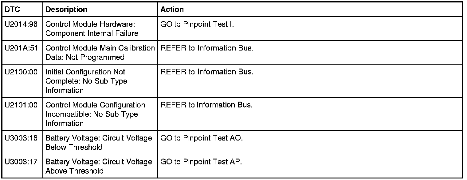 NOTE: This module utilizes a 5-character DTC followed by a 2-character failure-type code. The failure-type code provides information about specific fault conditions such as opens, or shorts to ground. Continuous memory DTCs have an additional 2-character DTC status code suffix to assist in determining DTC history.