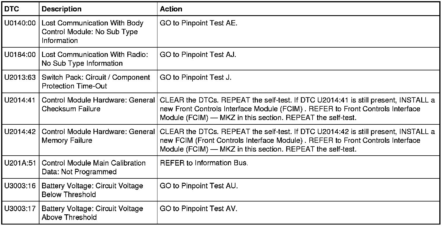 Front Controls Interface Module (FCIM) DTC Chart - MKZ Without Navigation, All Vehicles With Navigation