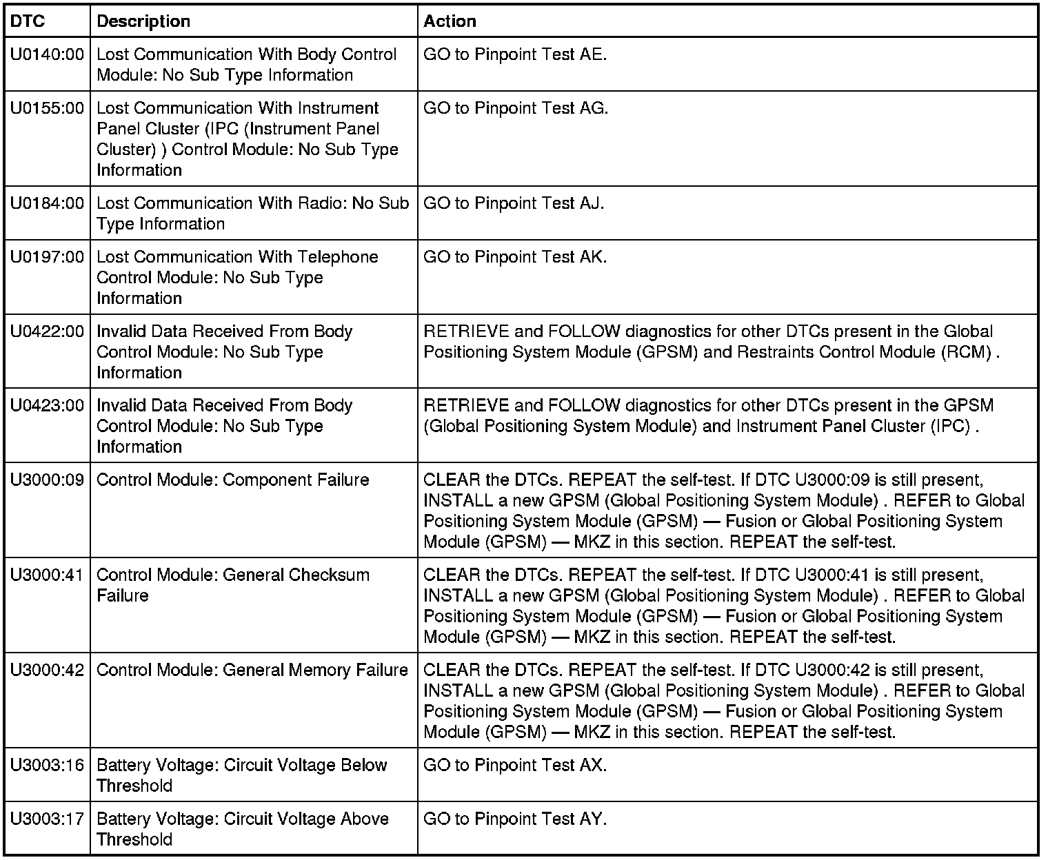 Global Positioning System Module (GPSM) DTC Chart