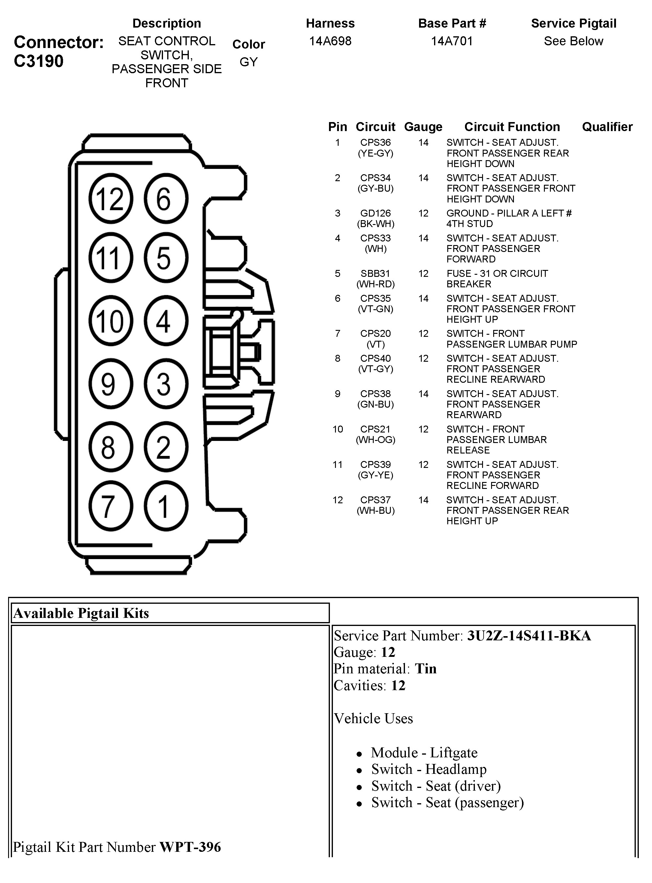 C3190 Seat Control Switch, Passenger Side Front