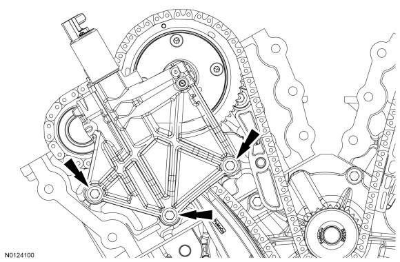 - Remove the LH VCT (Variable Camshaft Timing) assembly, secondary timing chain and the LH exhaust camshaft sprocket as an assembly.