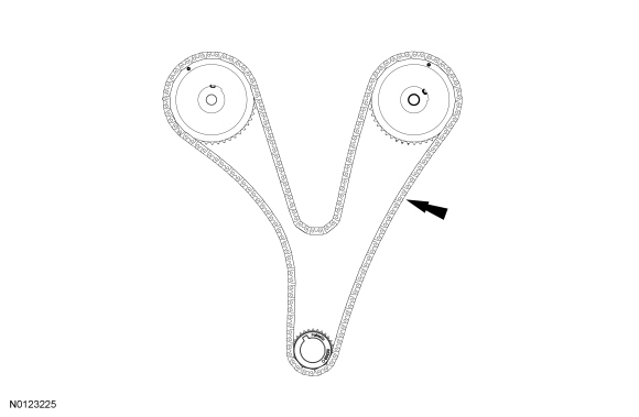 7. Mark the timing chain link that aligns with the timing mark on the RH intake VCT (Variable Camshaft Timing) assembly as shown.