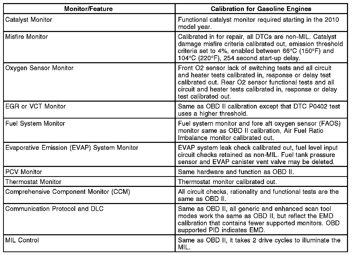 The following list indicates what monitors and functions have been altered from OBD II for gasoline engine EMD calibrations: