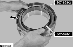 10. Position the low/reverse clutch piston on the Low Reverse Piston Seal Protector 307-628/1 and 307-628/2 and push it down into the center support.