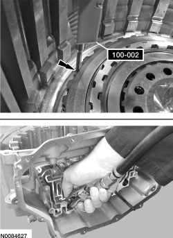 30. Position the plunger on one of the top direct (3, 5, R) clutch plate tabs. Apply 483 kPa (70 psi) of air pressure to the direct (3, 5, R) clutch piston port while recording the clutch pack clearance on Dial Indicator Gauge With Holding Fixture 100-002. The clearance should be between 0.412 mm (0.016 in) and 1.728 mm (0.068 in). If the clearance is out of range, check the direct (3, 5, R) clutch pack for correct installation. If the direct (3, 5, R) clutch pack is correctly installed, install a new direct (3, 5, R) clutch pack.