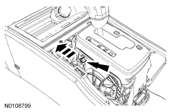 Using a suitable tool, push the brake shift interlock override forward, apply the brake, press the selector lever knob button and move the selector lever into NEUTRAL.