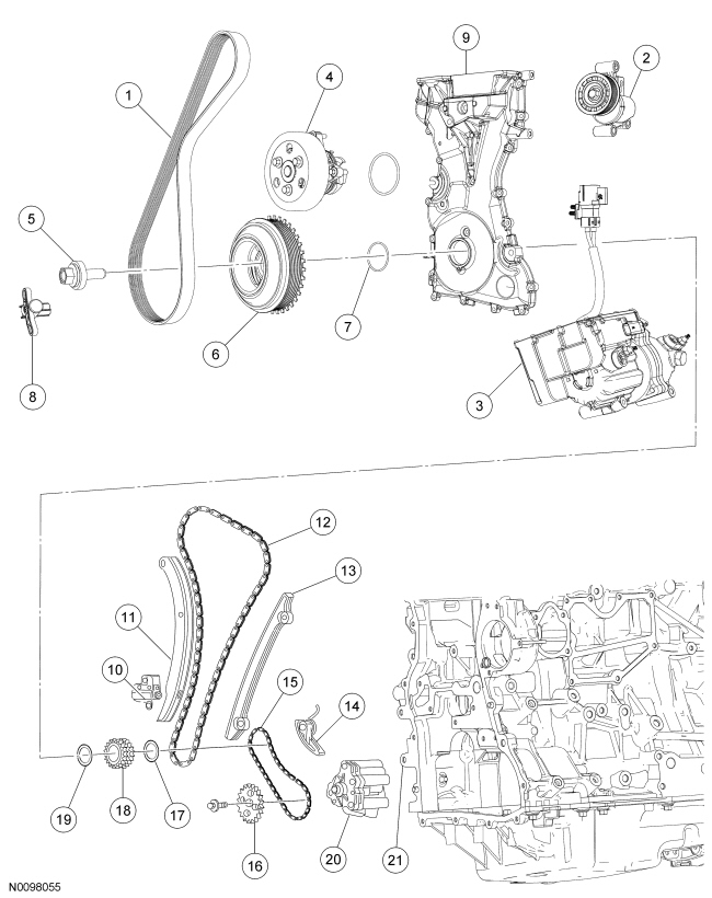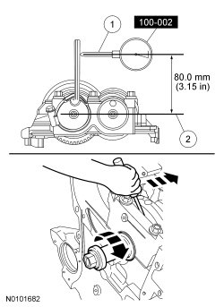 NOTICE: Do not loosen or remove the crankshaft pulley bolt without first installing the special tools as instructed in this procedure. The crankshaft pulley and the crankshaft timing sprocket are not keyed to the crankshaft. The crankshaft, the crankshaft sprocket and the pulley are fitted together by friction, using diamond washers between the flange faces on each part. For that reason, the crankshaft sprocket is also unfastened if the pulley bolt is loosened. Before any repair requiring loosening or removal of the crankshaft pulley bolt, the crankshaft and camshafts must be locked in place by the special service tools or severe engine damage can occur.