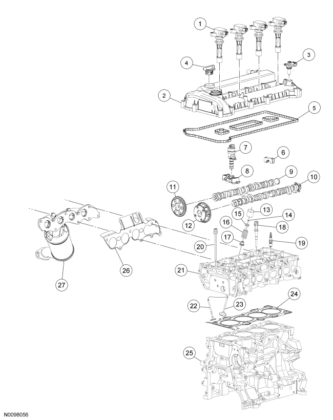 Install the camshafts and bearing caps in their original location and orientation. Tighten the bearing caps in the sequence shown in 3 stages: