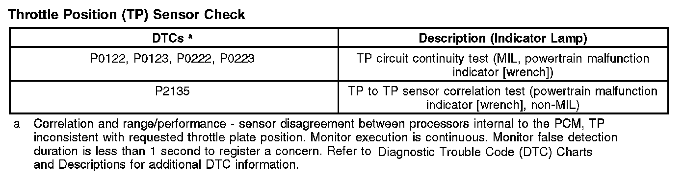 - There is one reference voltage and one signal return circuit between the PCM and the ETB. The reference voltage and the signal return circuits are shared with the reference voltage and signal return circuits used by the accelerator pedal position (APP) sensor. There are also two throttle position (TP) signal circuits for redundancy. The redundant TP signals are required for increased monitoring reasons. The first TP signal (TP1) has a negative slope (increasing angle, decreasing voltage) and the second signal (TP2) has a positive slope (increasing angle, increasing voltage). The TP2 signal reaches a limit of approximately 4.5 volts at approximately 45 degrees of throttle angle.
