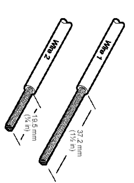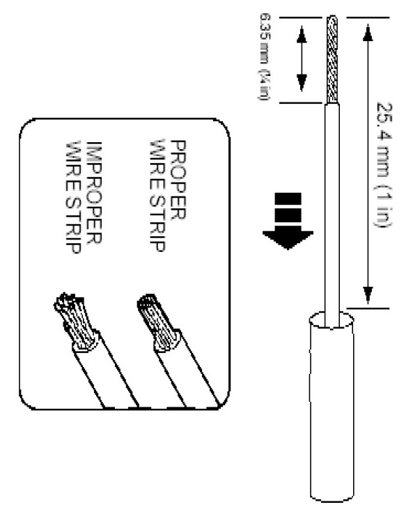 2. Strip 6.35mm (1/4 in) of insulation from each wire end, taking care not to nick or cut wire strands.