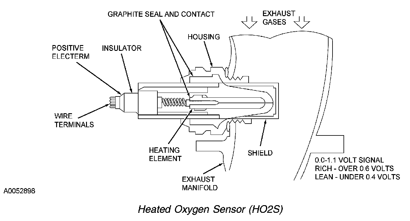 The HO2S detects the presence of oxygen in the exhaust and produces a variable voltage according to the amount of oxygen detected. A high concentration of oxygen (lean air/fuel ratio) in the exhaust produces a voltage signal less than 0.4 volt. A low concentration of oxygen (rich air/fuel ratio) produces a voltage signal greater than 0.6 volt. The HO2S provides feedback to the PCM indicating air/fuel ratio in order to achieve a near stoichiometric air/fuel ratio of 14.7:1 during closed loop engine operation. The HO2S generates a voltage between 0.0 and 1.1 volts.