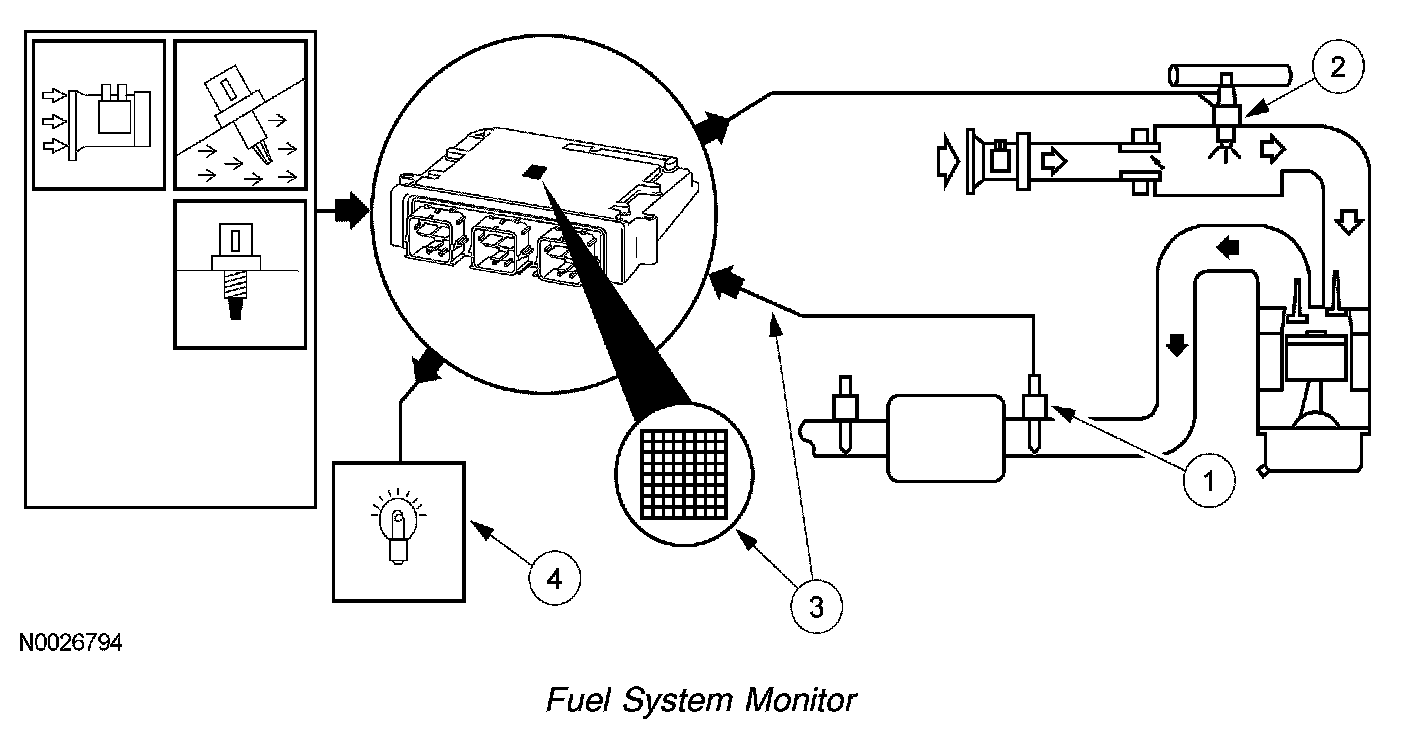 The fuel system monitor is an on-board strategy designed to monitor the fuel trim system. The fuel control system uses fuel trim tables stored in the powertrain control module (PCM) keep alive memory (KAM) to compensate for variability in fuel system components due to normal wear and aging. The fuel trim tables are based on engine RPM and engine load. During closed loop fuel control, the fuel trim strategy learns the corrections needed to correct a biased rich or lean fuel system. The correction is stored in the fuel trim tables. The fuel trim has 2 means of adapting: long term fuel trim and short term fuel trim. Both are described in greater detail under Powertrain Control Software, Fuel Trim. Long term fuel trim relies on the fuel trim tables. Short term fuel trim refers to the desired air/fuel ratio parameter called LAMBSE. LAMBSE is calculated by the PCM from the heated oxygen sensor (HO2S) inputs and helps maintain a 14.7:1 air/fuel ratio during closed loop operation. Short term fuel trim and long term fuel trim work together. If the HO2S indicates the engine is running rich, the PCM corrects the rich condition by moving the short term fuel trim in the negative range (less fuel to correct for a rich combustion). If after a certain amount of time the short term fuel trim is still compensating for a rich condition, the PCM learns this and moves the long term fuel trim into the negative range to compensate and allow the short term fuel trim to return to a value near 0%. Input from the cylinder head temperature (CHT), intake air temperature (IAT), and mass air flow (MAF) sensors is required to activate the fuel trim system, which in turn activates the fuel system monitor. As the fuel system components age or otherwise change over the life of the vehicle, the adaptive fuel strategy learns deviations from stoichiometry while running in the closed loop. These learned corrections are stored in the KAM as long term fuel trim (LONGFT) corrections. As components continue to change beyond normal limits, or if a concern occurs, the LONGFT reaches a calibrated rich or lean limit and the adaptive fuel strategy is no longer allowed to compensate for additional fuel system changes. LONGFT correction at their limits, in conjunction with a calibrated deviation in short term fuel trim (SHRTFT), indicate a rich or lean fuel system concern. The fuel system monitor stores the appropriate DTC when a concern is detected as described below.