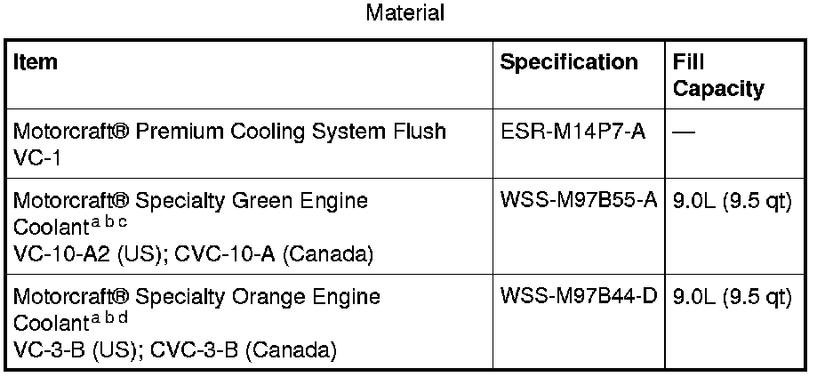 a The cooling system is filled with Motorcraft(R) Specialty Green Engine Coolant or Motorcraft(R) Specialty Orange Engine Coolant. Always fill the cooling system with the manufacturer's specified coolant. Chemically flush the cooling system if a non-specified coolant has been used.