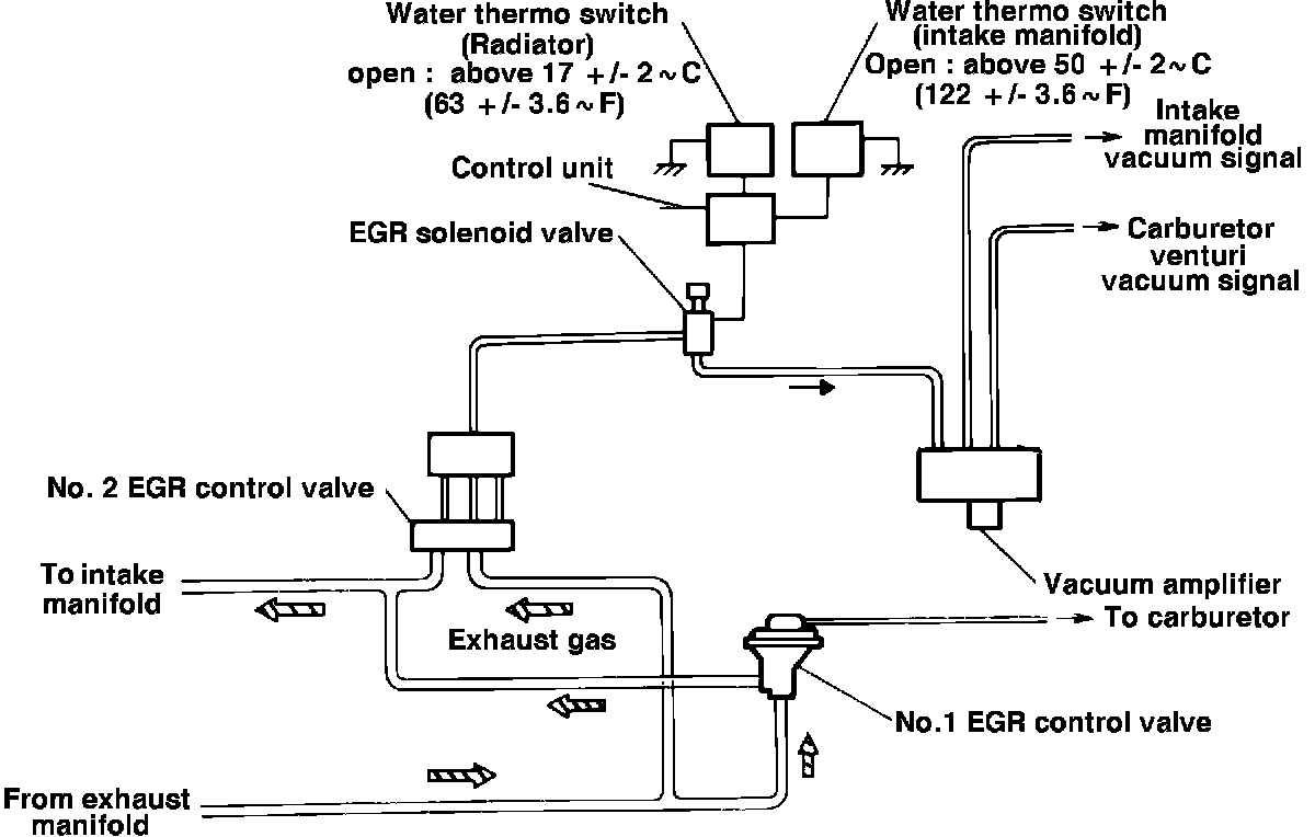 Two EGR valves are used on B2000 Federal Models for more precise control of EGR. The EGR solenoid valve will cut vacuum to the No. 2 EGR valve when radiator temperature is below 17~ +/- 2~c (63~ +/- 3.6~F) or when intake manifold temperature is below 50~ +/- 2~c (122~ +/- 36~F).