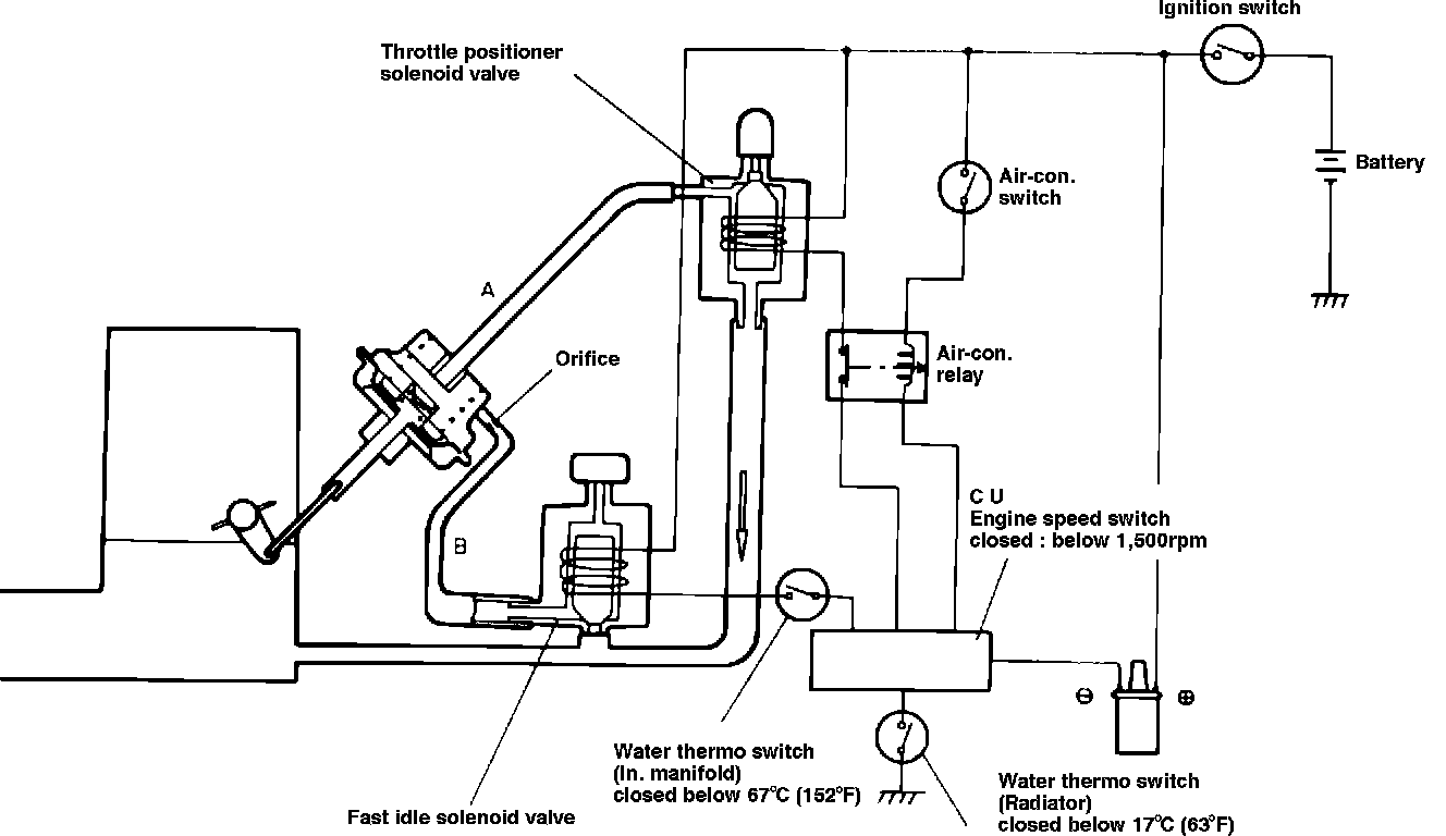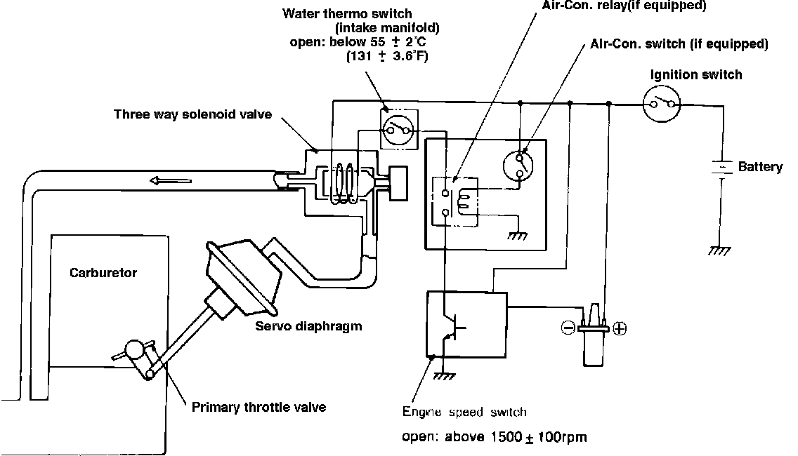 The fast idle solenoid is controlled by the water thermo switch (intake manifold), control unit and water thermo switch (radiator). When radiator coolant temperature is below 17~C (63~F), intake manifold coolant temperature is below 67~C (152~F) and engine rpm is below 1500 rpm, vacuum will be applied to the servo diaphragm through hose "B" and engine speed should increase to 1300 +/- 100 rpm.