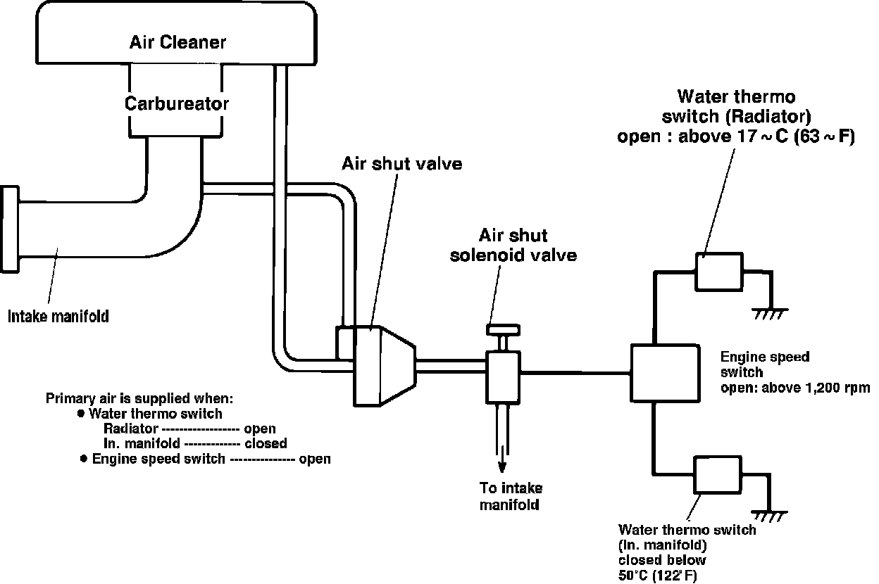 A water thermo switch located in the intake manifold has been added to the Throttle Positioner System. (When engine coolant temperature is below 55~ +/- 2~C (131~ +/- 36~F) the thermo switch will open and increase engine idling speed to 1100 rpm).