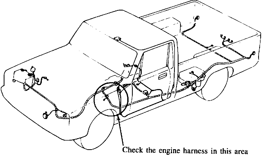Repair the engine harness as necessary and wrap the harness with electrical tape in the area of the metal hold down clamps to protect the harness.