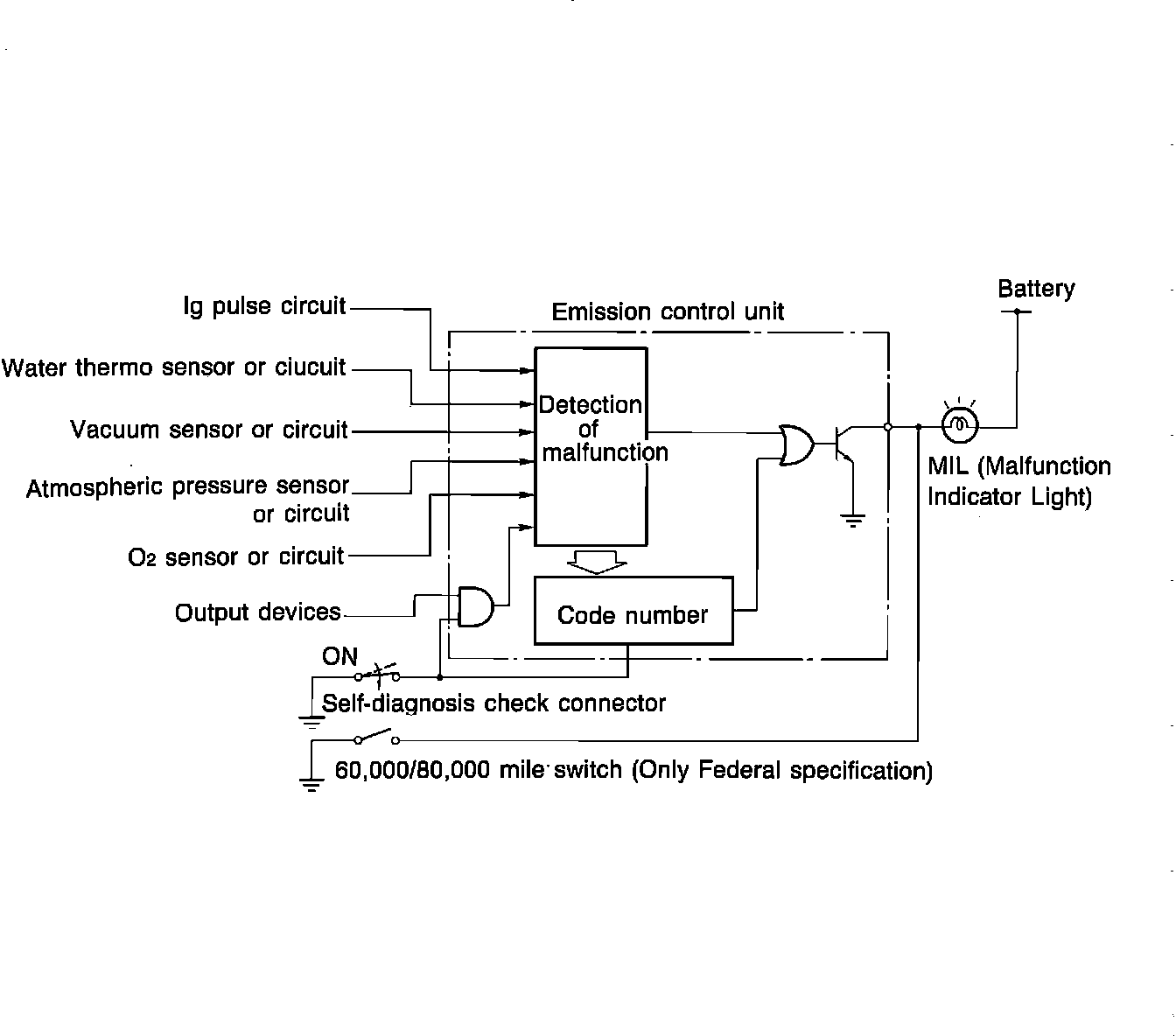 On Federal specification vehicles, the MIL also comes ON and stays on at 60,000 and 80,000 miles to indicate that maintenance of the emission control system is required. At this time, the MIL will not indicate a warning code (even with the check connector grounded) until the maintenance reminder is reset.