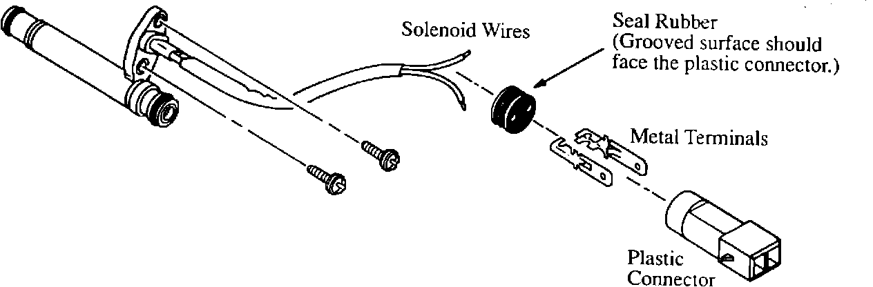8. Attach the 2 solenoid wires (w/ metal terminals) to the plastic connector. Refer to illustration.