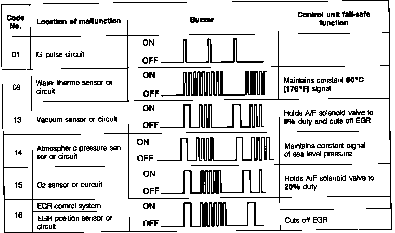 If more than one malfunction is detected by the control unit, the numbers will be displayed in numerical order. When all stored codes are displayed, the sequence will repeat itself. The emission control unit memory can be erased by disconnecting the battery ground cable for approximately five seconds. The control unit has a fail-safe mechanism for main input sensors which will substitute values to allow vehicle operation under certain malfunction conditions.