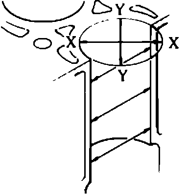 Inspect cylinder walls for scoring or indications of seizure and rebore or replace as necessary. Uneven wear on upper portion of cylinder wall may be repaired with a ridge reamer. Measure cylinder bore in six places indicated in Fig. 8. Standard bore diameter is 3.3859-3.3865 inches (86.000-86.019mm). Bore must not be worn more than .0059 inch (.150mm) and difference between bores must not exceed .0007 inch (.019mm). If necessary, rebore cylinder and install .010 inch (.25mm) or .020 inch (.50mm) oversize piston.