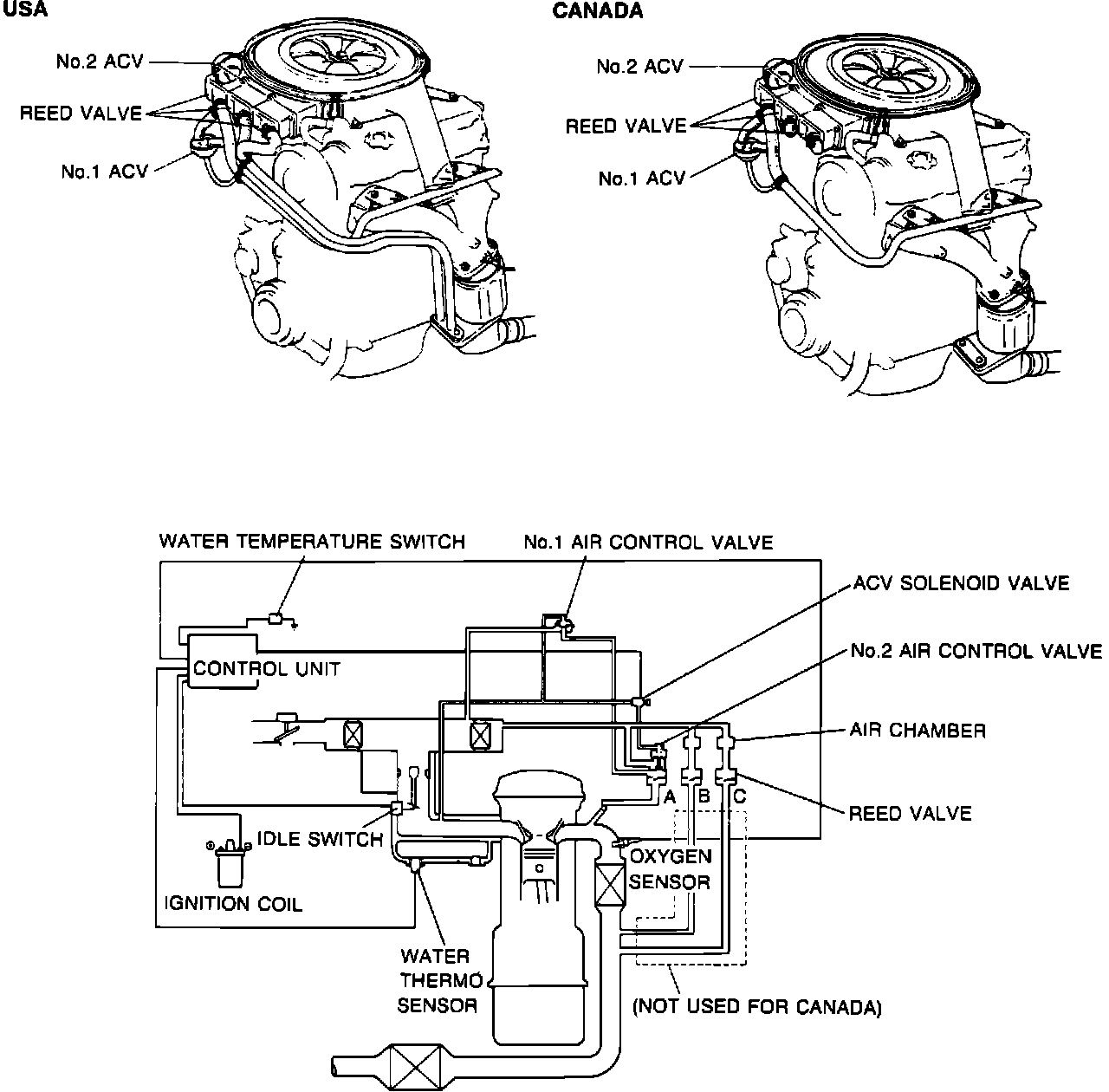 The system consists of: ACV solenoid valve, air control valves, reed valves, coolant temperature sensor, idle switch, and the engine control unit (ECU).