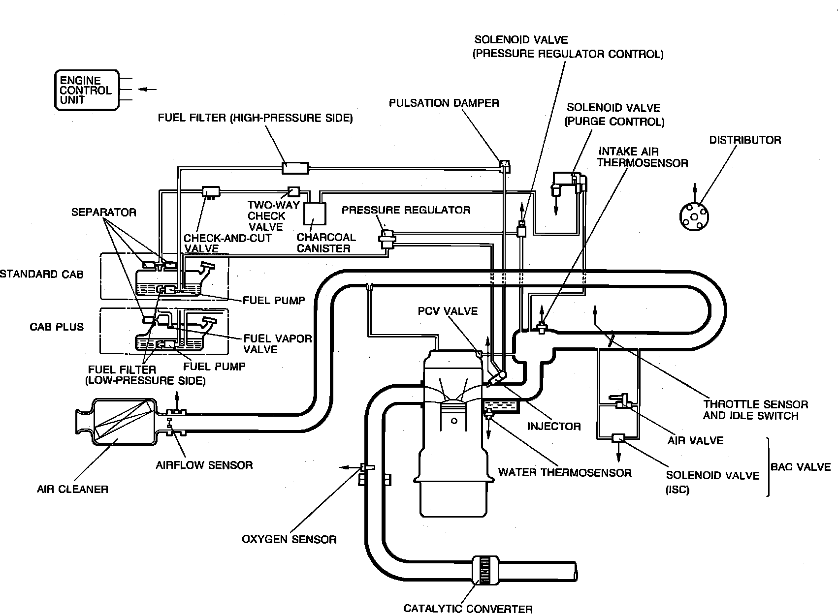 The ECU is a computer that judges air/fuel ratio as rich or lean according to an oxygen sensor voltage signal. Based on oxygen sensor and other input data, the ECU generates a controlling signal to the fuel injectors that regulates "ON" time. Because fuel pressure remains constant, the ECU controls air/fuel ratio adjustments by varying injector "ON" time.