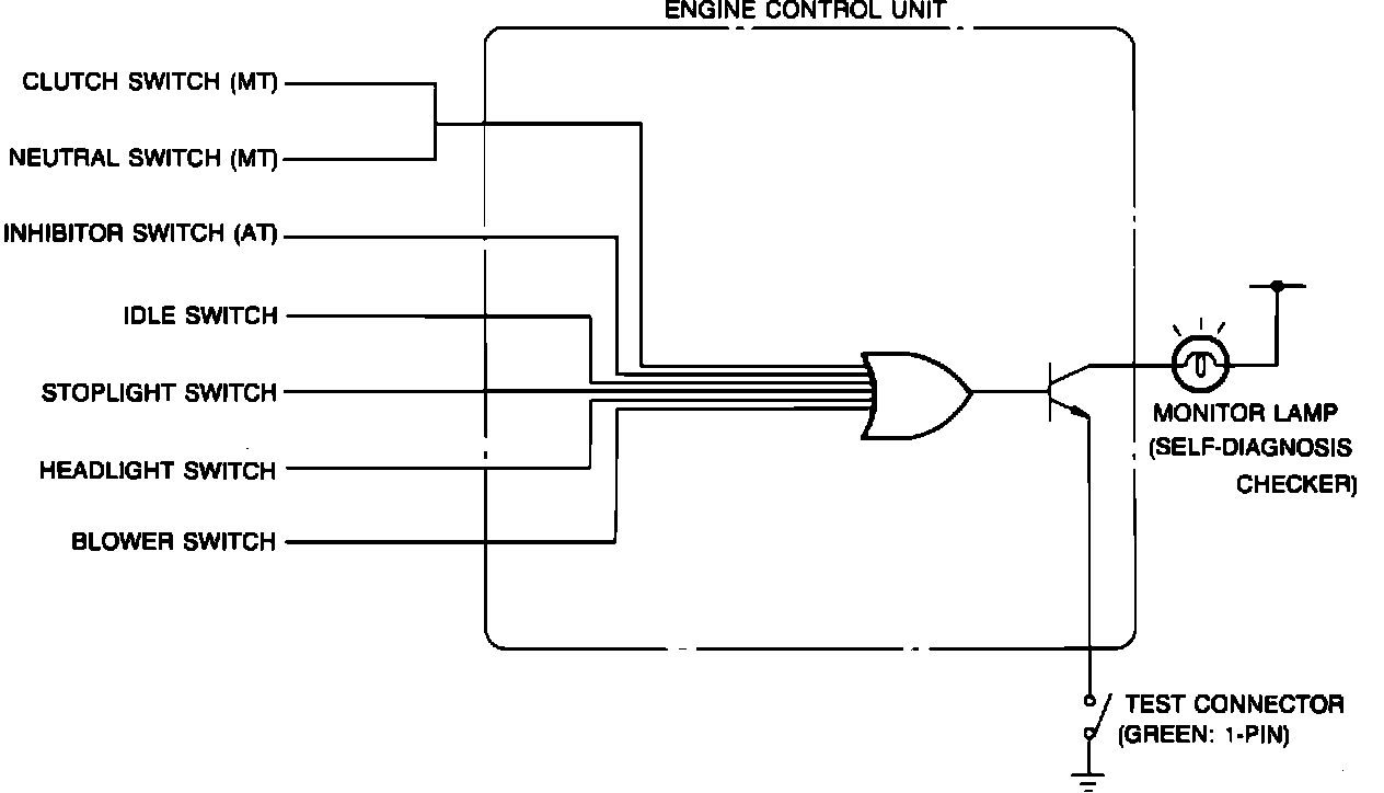 2. Connect self diagnostic tester (SST Mazda Part# 49 H018 9A1) to check connector (Green:6-pin) and negative battery terminal.