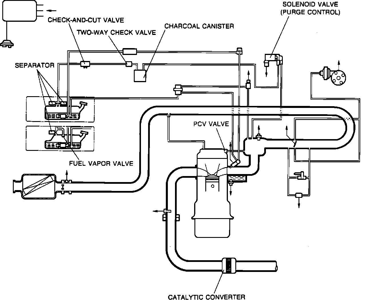 To reduce CO, HC, and NOx emissions, this vehicle uses a positive crankcase ventilation system, an evaporative emission control system, electronic gasoline injection, and a three-way catalytic converter.