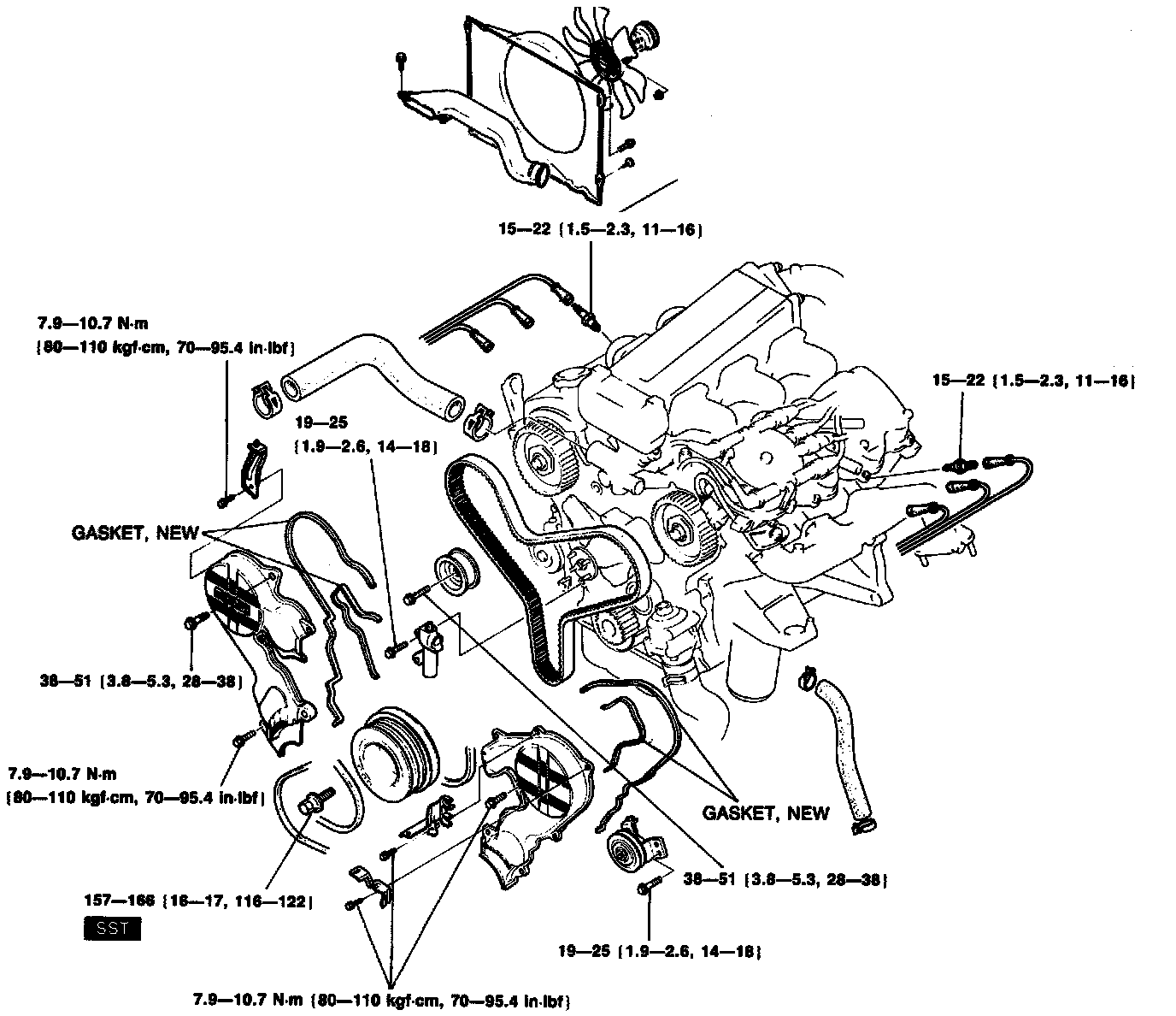 Timing belt deflection: 5-7mm {0.20-0.28 in }/98 N 10 kgf, 22 lbf}