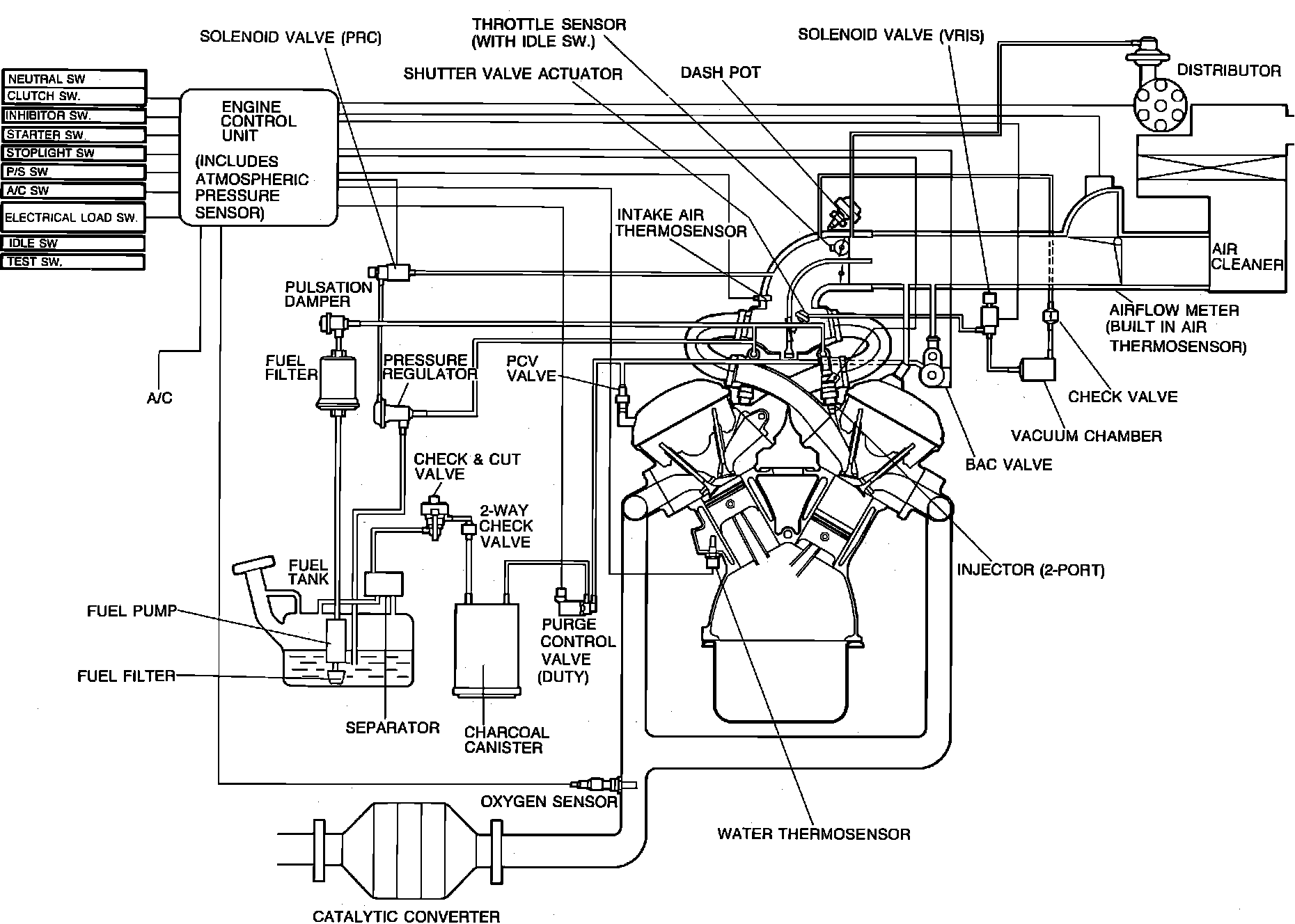 The ECU is a computer that judges air/fuel ratio as rich or lean according to a voltage signal generated by an oxygen sensor. Based on oxygen sensor and other input data, the ECU generates a controlling signal to the fuel injectors that regulates "ON" time. Because fuel pressure remains constant, the ECU controls air/fuel ratio adjustments by varying injector "ON" time.