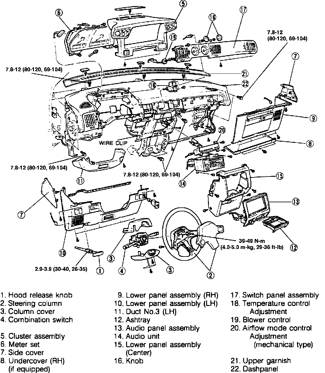 Disconnect battery ground cable and remove instrument panel components in order shown in