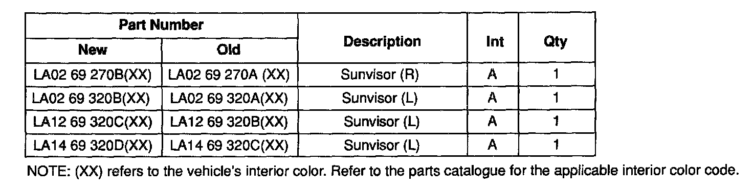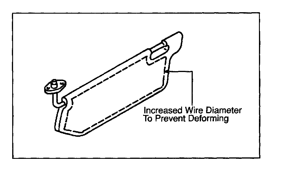 On some vehicles, the sunvisors may become deformed after repeated use. This condition is caused by insufficient clearance between the visor and the swivel base. To prevent deforming, the diameter of the wire that forms the visor body has been increased.