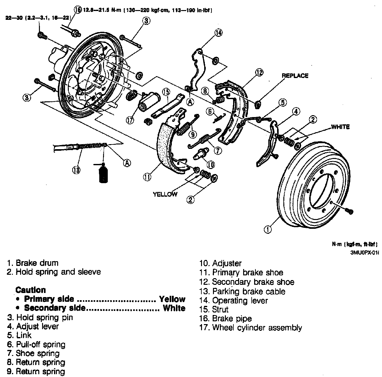 replacement procedures, refer to image for exploded view of drum brake assemblies.