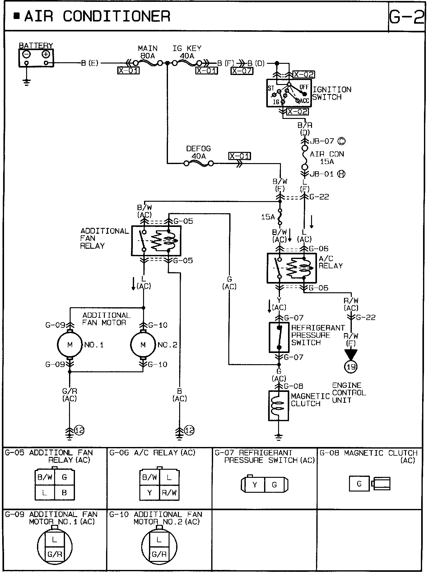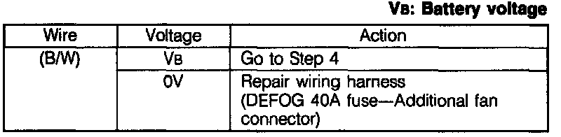 - Measure the voltage at terminal-wire (B/W) of the additional fan relay connector.