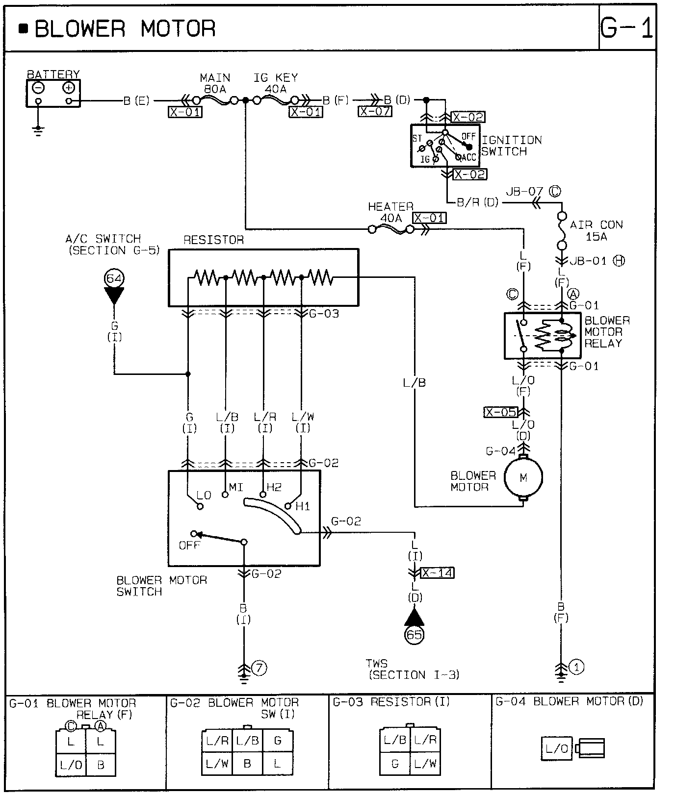When the blower switch is in the OFF position, the motor ground circuit is open and the blower motor does not operate. When the switch is in the first (Low) position, current flow from the blower motor is restricted by the three resistors (vehicles without A/C: four resistors) in the resistor assembly, and the blower motor turns at low speed.