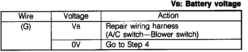 4. Measure the voltage at terminal-wire (G) of the A/C switch connector.