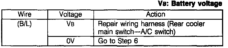 5. Measure the voltage at terminal-wire (B/L) of the rear cooler main switch connector.