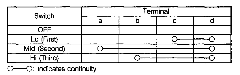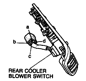 2. Check continuity between terminals of the rear cooler blower switch connector as shown.