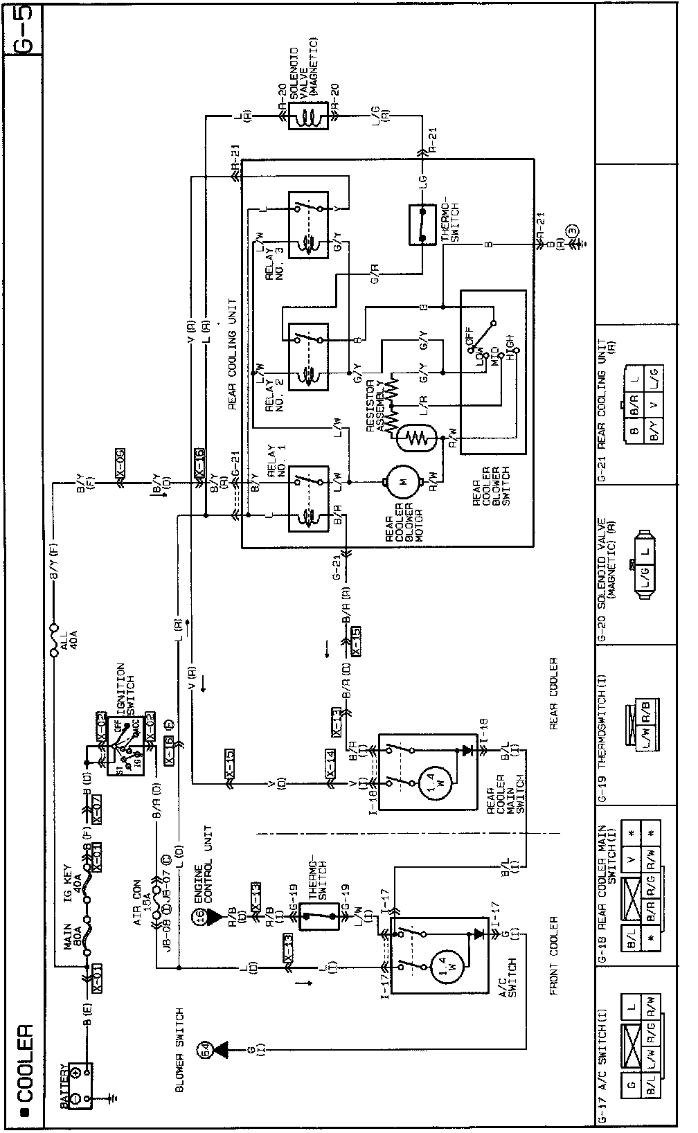 When the A/C switch and front blower switches are ON, rear blower motor operation becomes possible. When the A/C switch, front blower switch, and rear cooler main switches are ON, the rear blower motor receives power through relay No.1. When the rear blower switch is ON the ground circuit is completed and the motor operates.