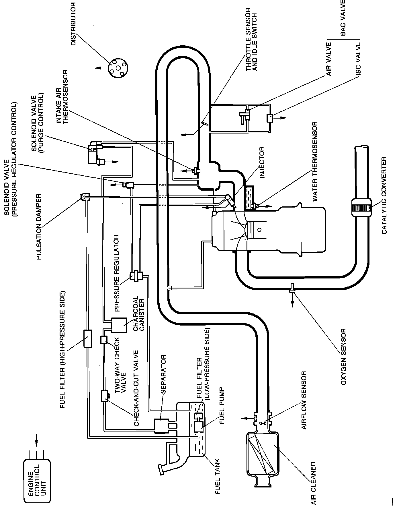 The ECU is a computer that judges air/fuel ratio as rich or lean according to a voltage signal generated by an oxygen sensor. Based on oxygen sensor and other input data, the ECU generates a controlling signal to the fuel injectors that regulates "ON" time. Because fuel pressure remains constant, the ECU controls air/fuel ratio adjustments by varying injector "ON" time.