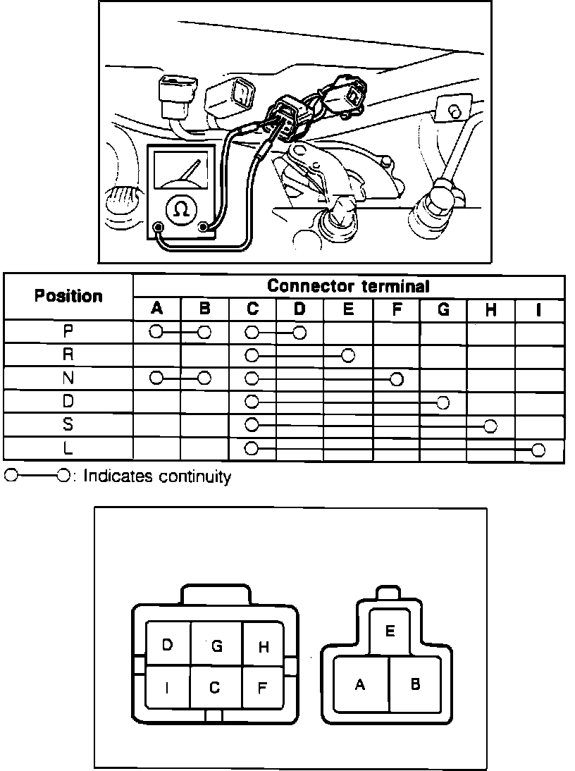 Inhibitor switch input voltage can be checked at ECU terminal 1V with ignition "ON." In "N" or "P" range terminal voltage should be 0V. In other ranges, voltage should be approximately 12V.